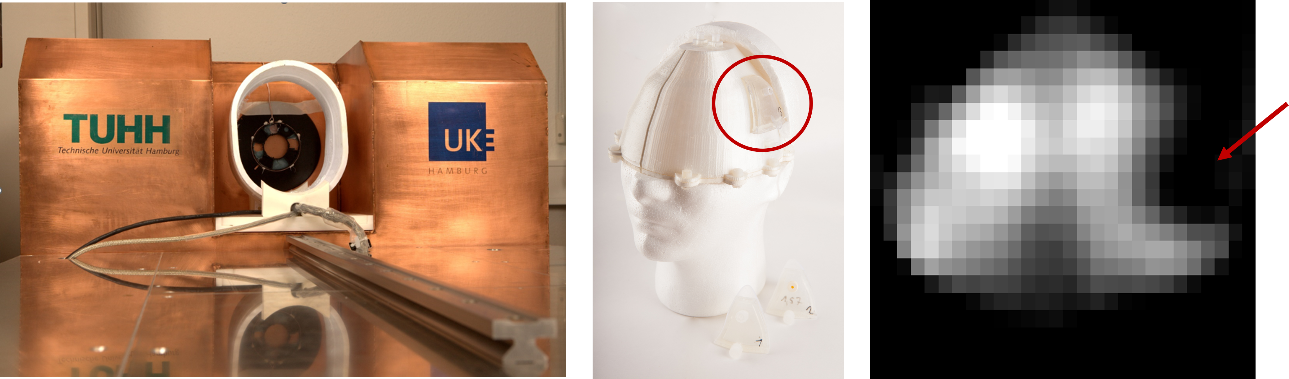 To evaluate the suiteability of the system two experiments were taken out: First, a static experiment with two nanoparticle filled hemispheres containing a concentration of 965 ng/ml iron. This concentration corresponds well to the concentration expected within the brain considering both blood and brain matter. On the right hemispere a small region of 42 ml was left without nanoparticles to represent a very small stroke. This can easily be identified on the reconstructed image.
